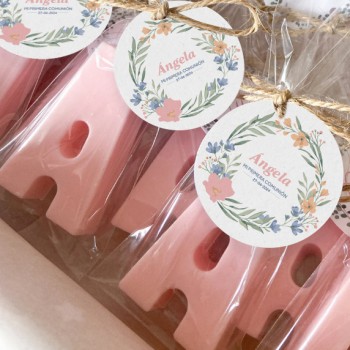 Usamos jabón hecho con ingredientes naturales y libre de SLS. Cada letra de jabón tiene una altura de unos 5 cm. La etiqueta está impresa en cartulina y se entrega junto a los jabones en una funda de celofán.
