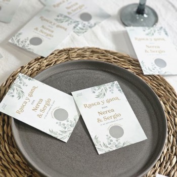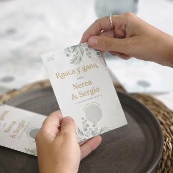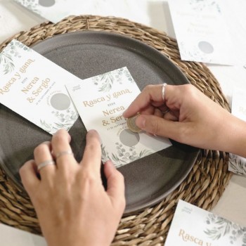 Una manera original de impresionar a tus invitados es con un "rasca y gana". Puedes introducirlo en cualquier parte del banquete para generar un momento divertido donde uno de tus invitados ganará el premio que elijas. ¡Seguro que se divierten muchísimo! Los rascas ganadores se envían señalados y aparte de los no ganadores.