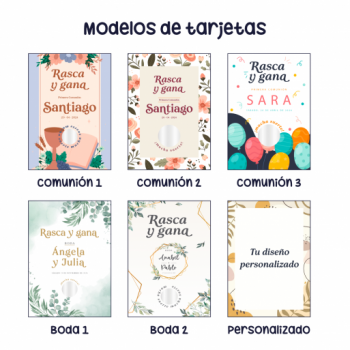 Imagina la emoción en el ambiente cuando tus invitados descubran estos rascadores personalizados. Desde pequeñas delicias hasta regalos más significativos, la elección del premio está en tus manos.Este detalle no solo agrega un toque de diversión a tu celebración, sino que también crea un momento único e interactivo para tus seres queridos. Ya sea durante el brindis, la cena o algún intervalo, cada rasca se convierte en una oportunidad para compartir risas, anécdotas y hacer que la ocasión sea inolvidable