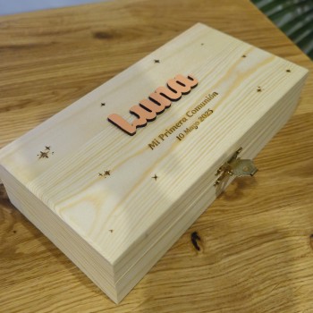 Sorprende a lo grande con nuestra caja de madera grabada a láser, personalizada con nombre y frase, que guarda la llave de un viaje inolvidable.