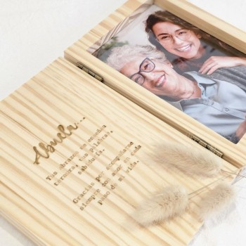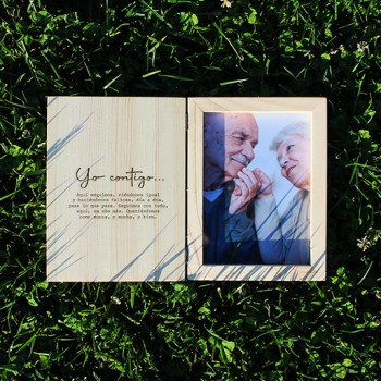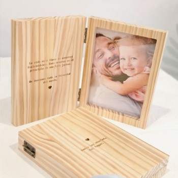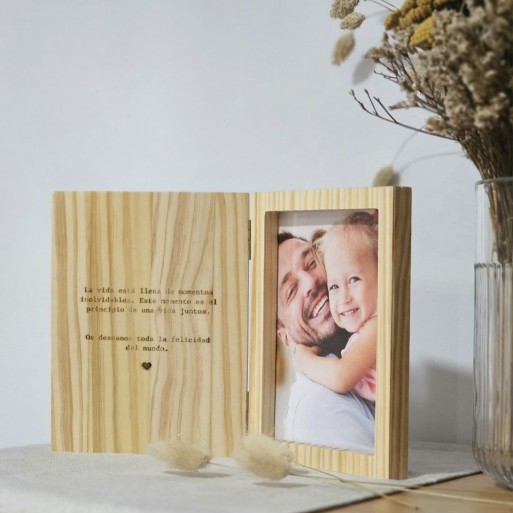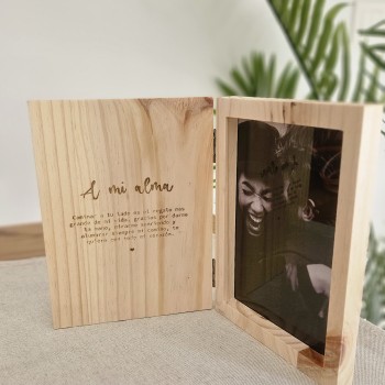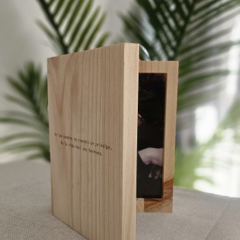 Cuadro de madera hecho a mano con grabado personalizado sobre la madera en ambas caras de la portada y marco con foto en la contraportada.