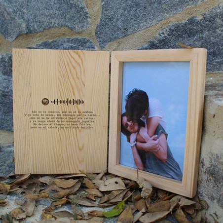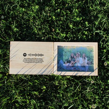 Cuadro de madera hecho a mano con grabado personalizado sobre la madera en ambas caras de la portada y marco con foto en la contraportada.