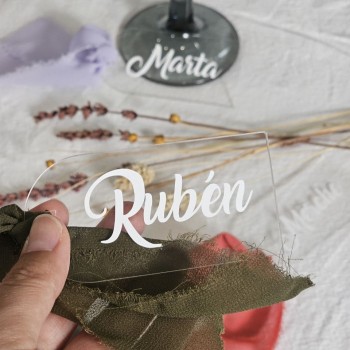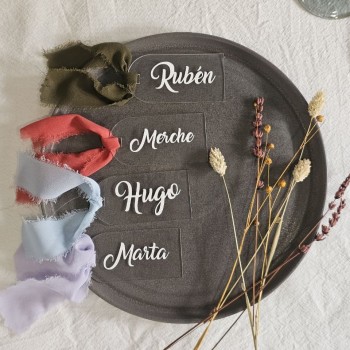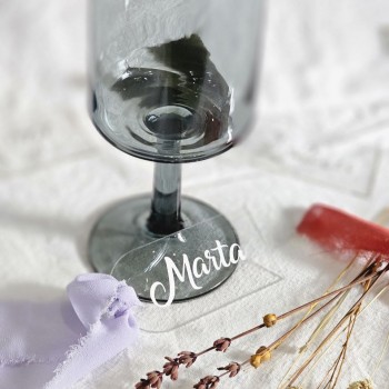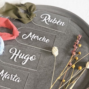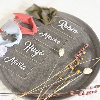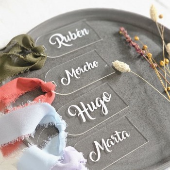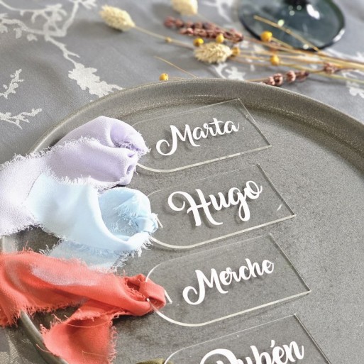 Nuestros marcasitios de boda son el detalle perfecto para dar un toque elegante y personalizado a tu celebración. Realizados en material transparente y decorados con vinilo blanco, incluyen el nombre de cada invitado para que puedan encontrar fácilmente su lugar en la mesa. Además, se complementan con un lazo disponible en diferentes colores a elegir, lo que permite adaptarlos a la paleta de tu boda. Un recuerdo sencillo, práctico y decorativo que aportará un aire único y especial a tu banquete.