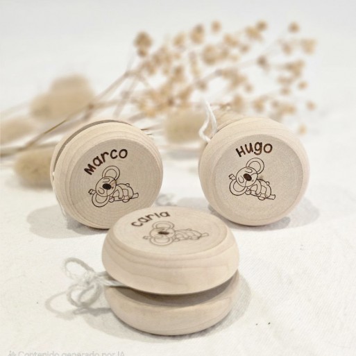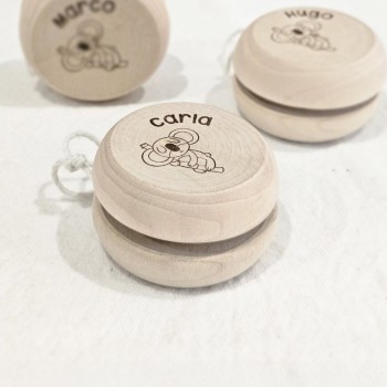 El yoyó es de madera con un diámetro de 5 cm. La personalización se realiza con grabado láser.