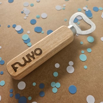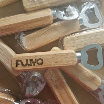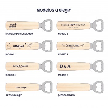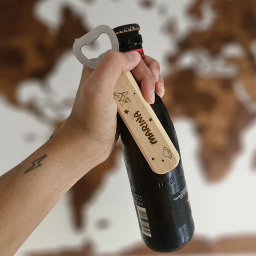 El abrebotellas es de madera y metal. Su tamaño total es de 13,9 cm de largo y 3,9 cm de ancho. El mango de madera es de 2,7 cm y tiene un grosor de 1,8cm. La personalización se realiza con grabado láser.