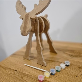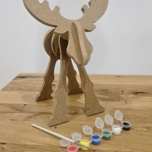 Reno navideño para montar con 5 piezas de madera con ranuras. Puedes comprarlo sin pintar o añadir el kit de pintura para que los más peques lo decoren a su gusto.