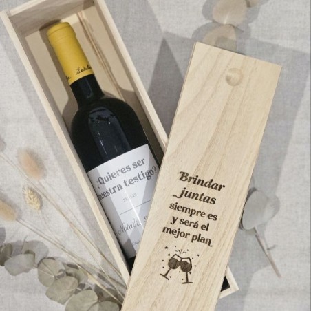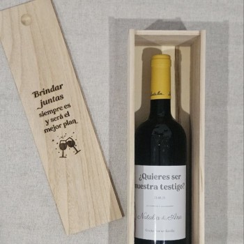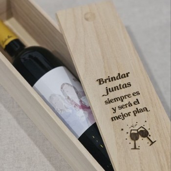 La caja con la personalización que elijas + etiqueta para que puedas pegarla en la botella de vino que elijas. NO INCLUYE BOTELLA DE VINO. La etiqueta de la botella que tengas, recomendamos eliminarla para poner la nueva con alcohol y laca.